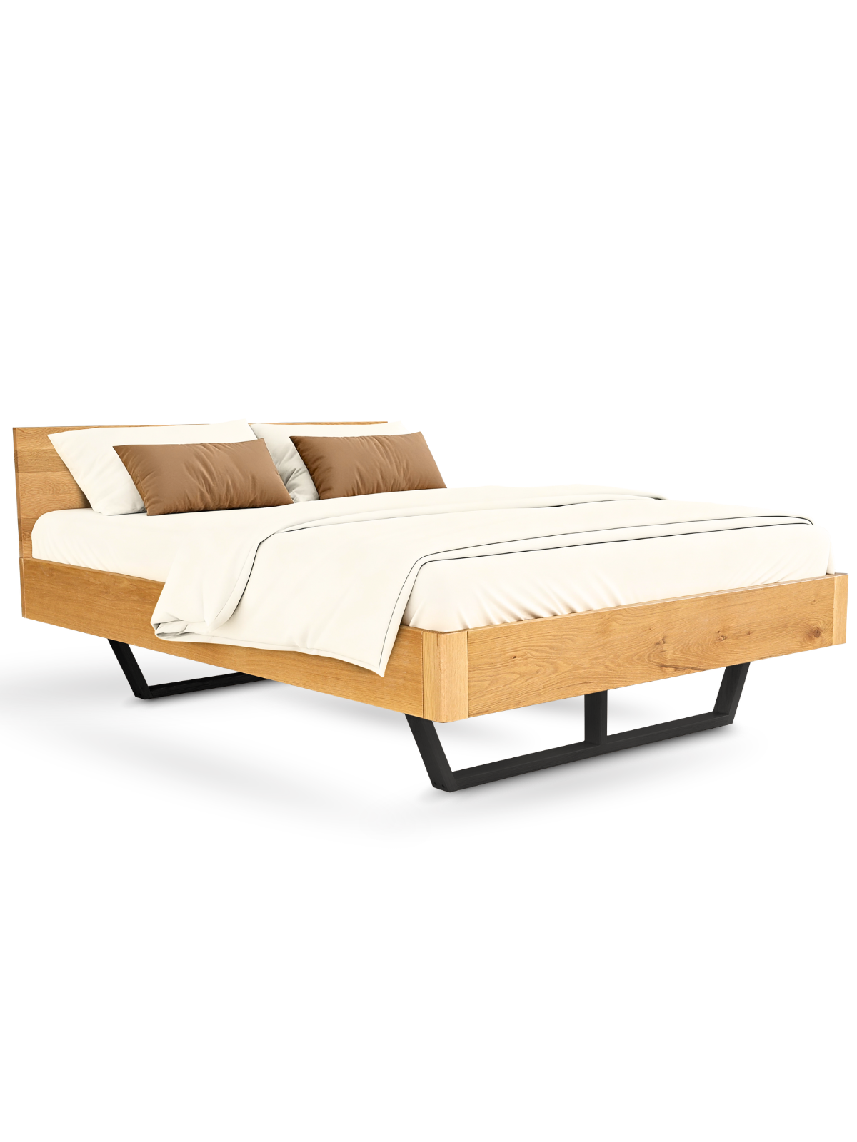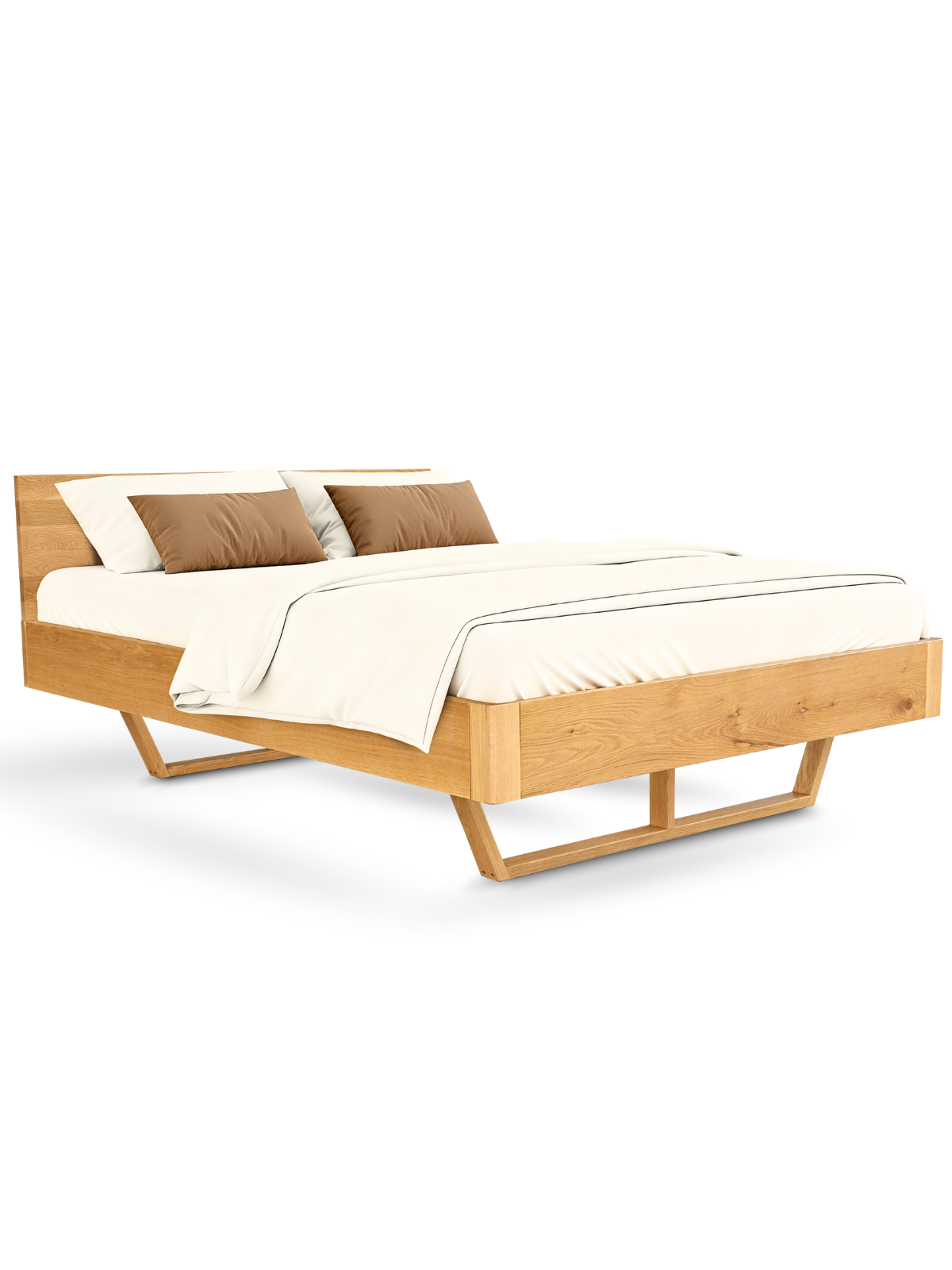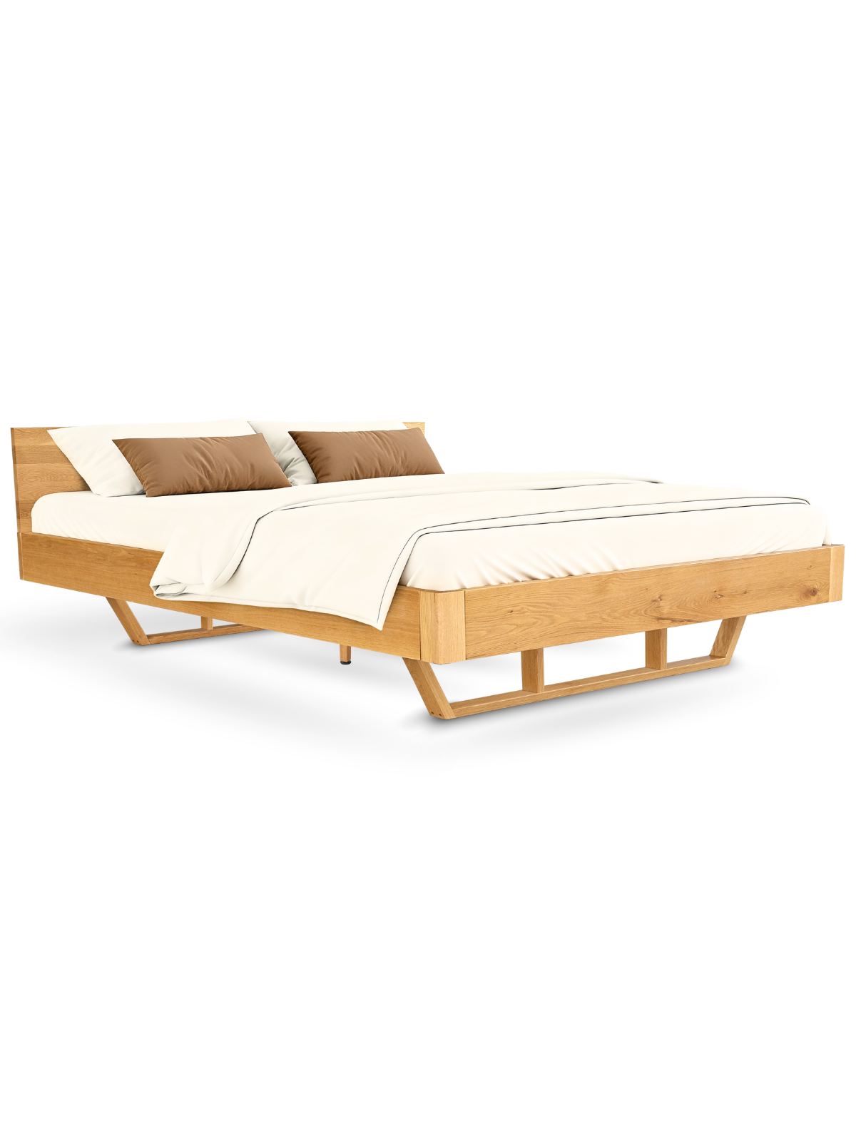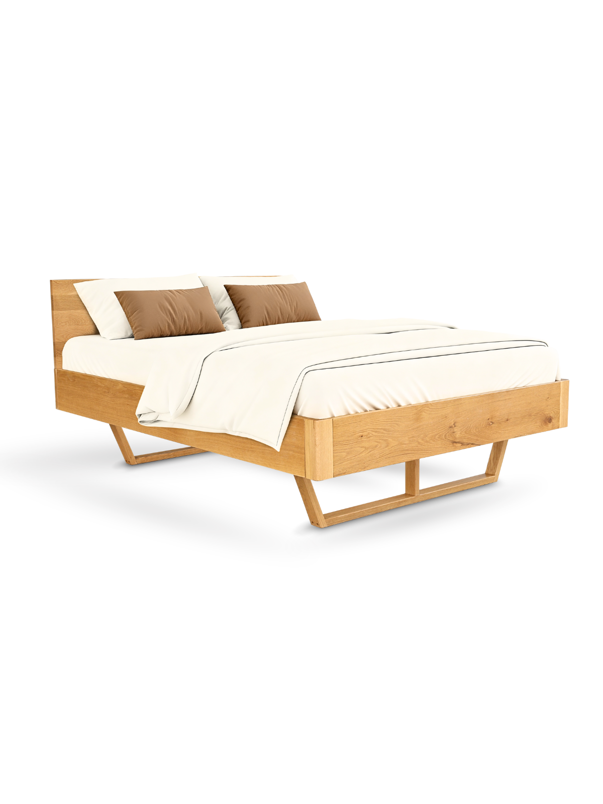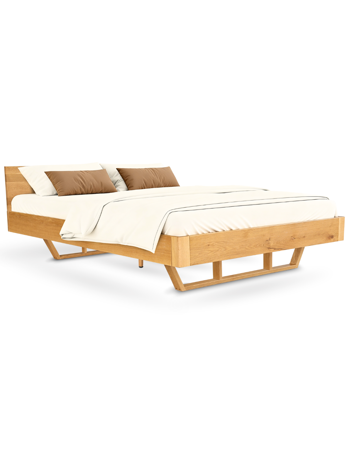 Massivholzbett 180x200cm: Für alle, die viel Platz und Komfort suchen. Hergestellt aus 100% geölter Eiche, mit stabilen Kufen und montagefreundlichem Stecksystem. Kombiniert ästhetische Eleganz mit hoher Alltagstauglichkeit.