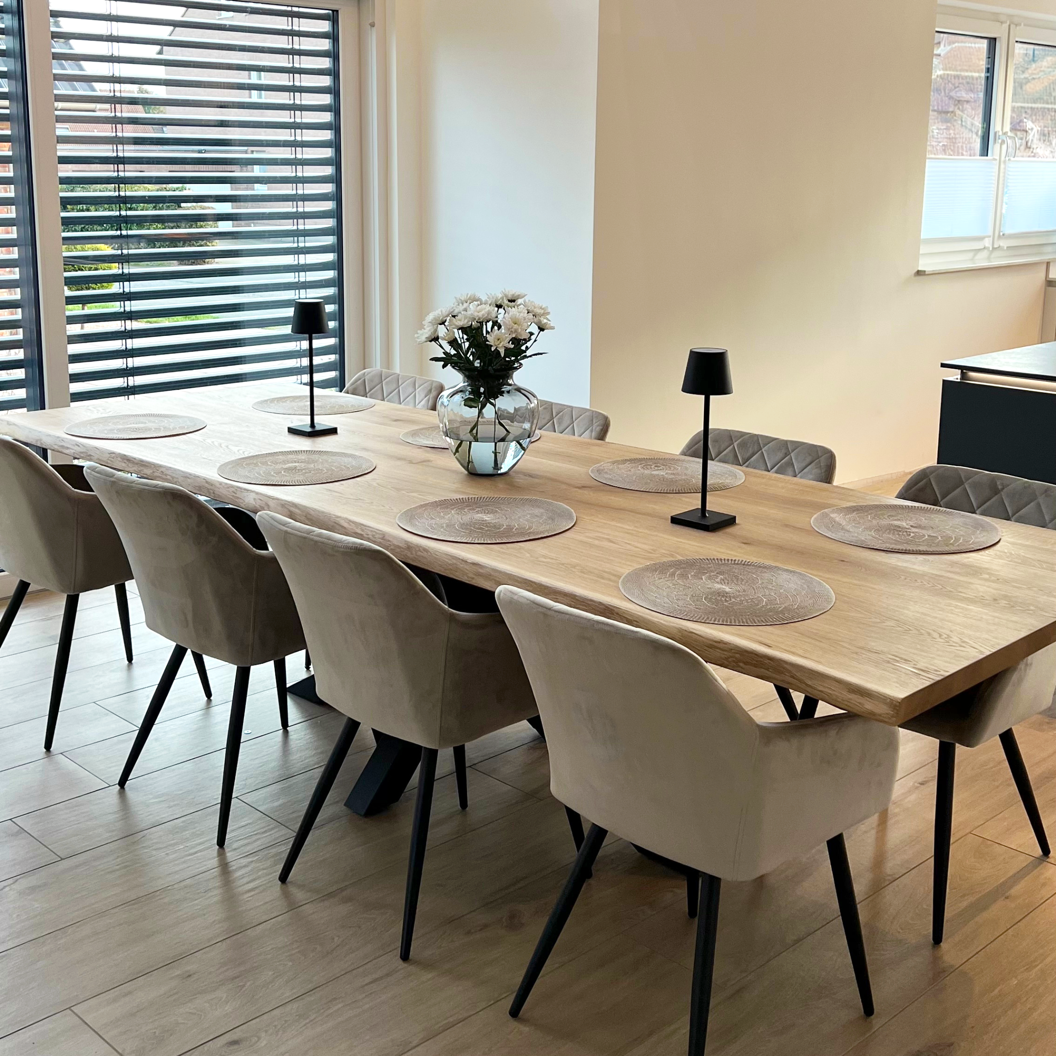 Die holz4home® Tischplatten sind aus 4 cm dickem, massivem Eichenholz gefertigt und bieten eine hohe Stabilität und Langlebigkeit. Verstärkt mit Gratleisten, um ein Verbiegen zu verhindern, gewährleisten sie dauerhafte Schönheit und Funktionalität. Zu den eckigen und runden Tischplatten gibt es passende Tischgestelle, die perfekt auf das Design der Tische abgestimmt sind.