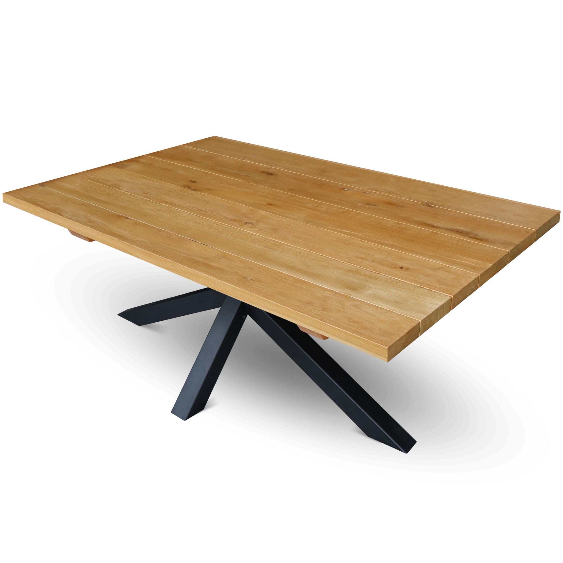 - Massives Eichenholz: Die Tischplatte besteht aus massivem, 4 cm dickem Eichenholz, das für seine Stabilität und Langlebigkeit bekannt ist. 6 einzelne Bohlen zeichnen den Massiven Tisch aus.
