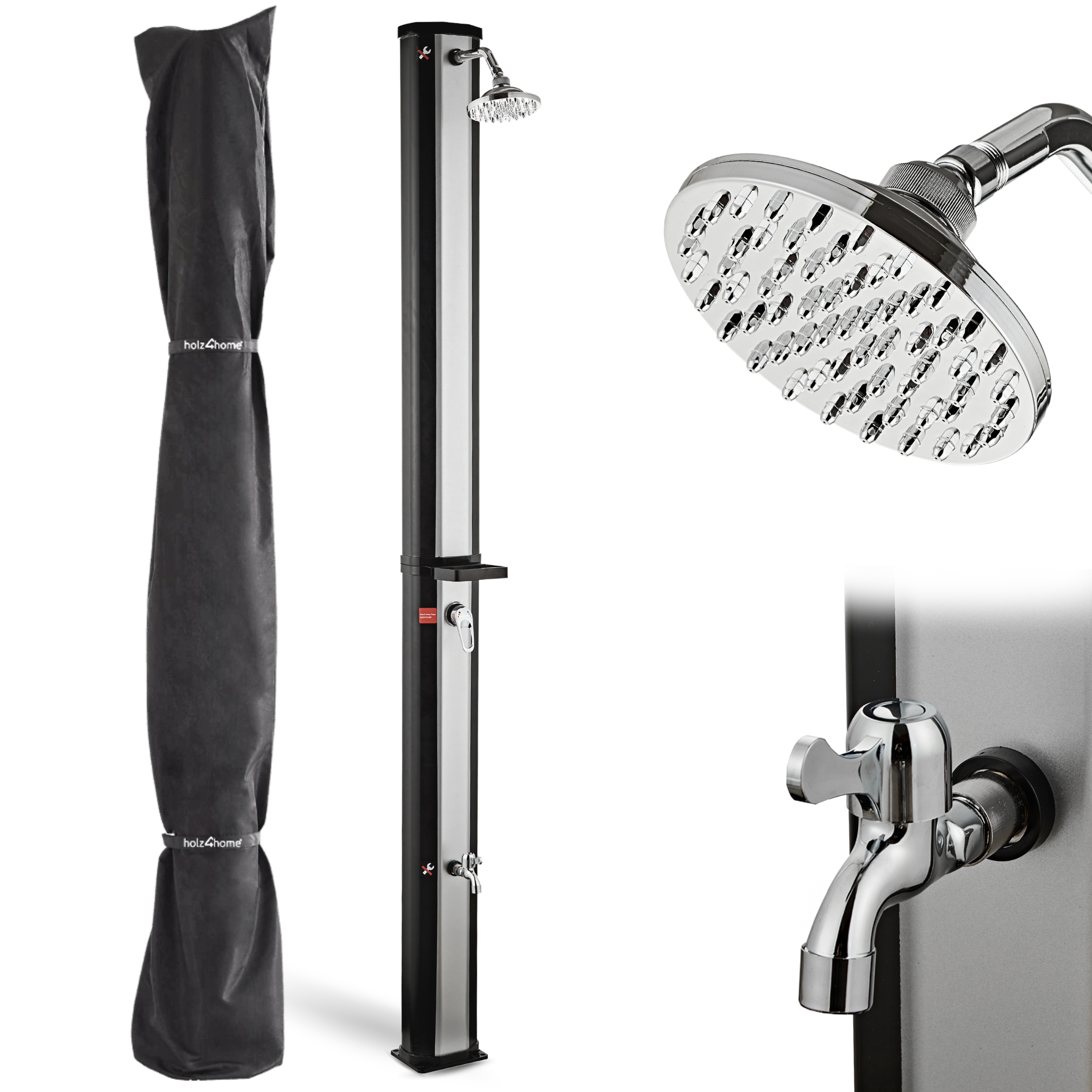 Unsere Solardusche bietet Ihnen eine perfekte Lösung für erfrischende Duschen im Garten oder am Pool. Sie können zwischen einem Volumen von 35 oder 40 Litern wählen, um längere Duschsessions zu genießen. Der schwenkbare Duschkopf ermöglicht eine flexible Ausrichtung, während der integrierte Temperaturregler Ihnen erlaubt, die Wassertemperatur nach Ihren Wünschen einzustellen. Zusätzlich sorgen die praktische Seifenablage und die integrierte Fußdusche für zusätzlichen Komfort und Bequemlichkeit beim Duschen im Freien.
